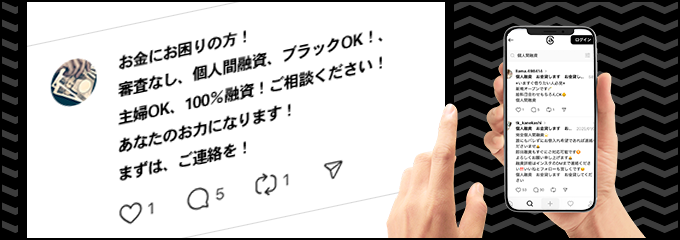 SNSで「#個人間融資」といったハッシュタグを使い、お金に困っている人を探し出してダイレクトメッセージを送るのが典型的な手口です。